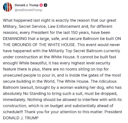 “What happened last night is exactly the reason that our great Military, Secret Service, Law Enforcement and, for different reasons, every President for the last 150 years, have been DEMANDING that a large, safe, and secure Ballroom be built ON THE GROUNDS OF THE WHITE HOUSE,” Trump wrote on his Truth Social platform.